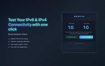 IPv6 / IPv4 연결 확인은 IPv4 및 IPv6 프로토콜에 대한 네트워크 연결을 신속하게 평가하기 위해 설계된 무료 Chrome 추가 기능입니다. 이 도구는 사용자가 자신의 네트워크 기능을 빠르게 확인할 수 있게 하여 인터넷 연결이 이중 스택 기능을 지원하는지 여부를 판단할 수 있도록 합니다. 간단한 인터페이스를 통해 실시간 점수를 제공하여 사용자가 한눈에 네트워크 상태를 이해할 수 있도록 합니다.